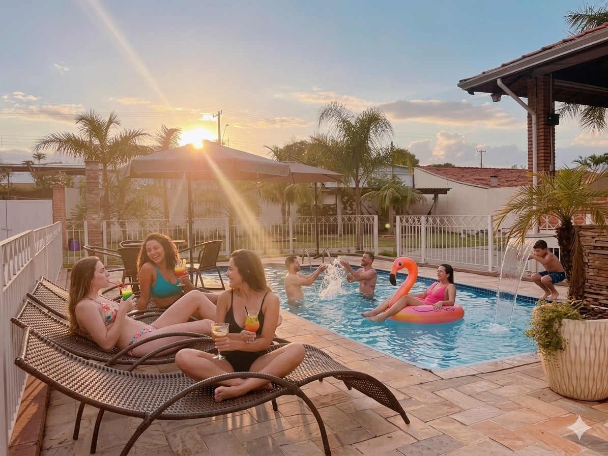 Ένας ιδανικός χώρος για να χαλαρώσετε με την οικογένεια και τους φίλους σας, με μεγάλο εξωτερικό χώρο, περιφραγμένη πισίνα, πλήρες μπάρμπεκιου και ποικίλες επιλογές αναψυχής για ενήλικες και παιδιά. • Πισίνα με καταρράκτη και χώρο ξεκούρασης • Οθόνη προβολής ταινιών με καραόκε • Δεντρόσπιτο και παιδική χαρά • Μικρό γήπεδο με δίχτυ μπιτς βόλεϊ • Πέργκολα με αιώρες για ξεκούραση • Δωμάτια με κλιματισμό Άφιξη 16:00 Αναχώρηση στις 11 Πιθανή πρόωρη/καθυστερημένη άφιξη Βασική τιμή σε R$ για έως 5 άτομα (πέραν αυτού, 50 R$/άτομο/διανυκτέρευση)