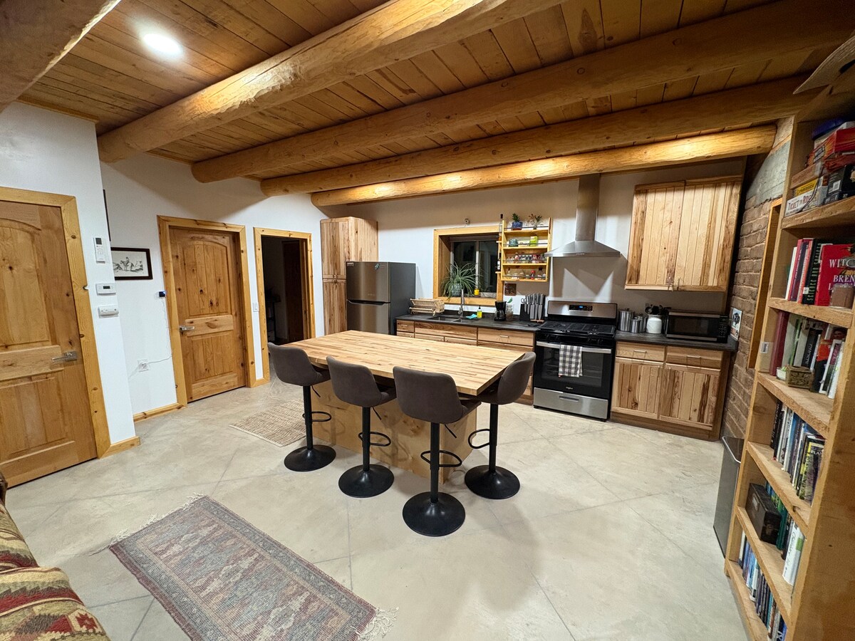 Το ενοικιαζόμενο ξυλόσπιτο διακοπών Pinon βρίσκεται κατά μήκος του φαραγγιού Bear Creek σε υψόμετρο 4800 ποδιών. Η νοτιοδυτική τοποθεσία του Νέου Μεξικού, με τον σχεδόν τέλειο καιρό όλο τον χρόνο, είναι δύσκολο να ξεπεραστεί! Μέσος όρος 280+ ημέρες ηλιοφάνειας, εκπληκτικός γαλάζιος ουρανός και 7"-13" βροχή ετησίως παρέχουν πιο ήπια καλοκαίρια και χειμωνιάτικες συνθήκες που ο κόσμος από τον βορρά ονειρεύεται ενώ φτυαρίζει χιόνι! Το ξυλόσπιτο Pinon είναι η εκδοχή μας για ένα άνετα επιπλωμένο, ρουστίκ ενοικιαζόμενο κατάλυμα διακοπών τύπου στούντιο, ιδανικό για έναν ή δύο οικείους. Με περίπου 430 τετραγωνικά πόδια, αυτό το μικρό ξυλόσπιτο είναι μεγάλο σε ευκολία. Απροσδόκητη ομορφιά κρύβεται κατά μήκος της κοιλάδας όπου περνάει το Bear Creek. Στο τέλος ενός καλά διατηρημένου χωματόδρομου 4 μιλίων, θα βρείτε τα 360 στρέμματα μας στο νοτιοδυτικό Νέο Μεξικό που περιβάλλεται από αρχαία δέντρα βαμβακοδρυός, πίνιον και πλατάνια. (GPS: 32,969224, -108,525218). Αυτό το ξυλόσπιτο στο "τέλος του δρόμου" μαζί με τις άλλες 4 ρουστίκ ιδιοκτησίες μας, θα ικανοποιήσει την ανάγκη σας να αποσυνδεθείτε, να ξεφύγετε από το κρύο, τα πλήθη, το άγχος. Το γραφικό χωριό Gila απέχει 10 λεπτά με το αυτοκίνητο και προσφέρει ιατρική κλινική, βιβλιοθήκη, ταχυδρομείο, γκαλερί τέχνης και είναι πραγματικά η "Πύλη για το δάσος Gila". Εξακολουθεί να είναι βολικό για μεγάλα ψώνια στο Silver City, NM και με μια εύκολη διαδρομή 35 λεπτών, θα απολαύσετε την περιήγηση σε μια ποικιλία καταστημάτων, καταστήματα με αντίκες και μποέμ, ασημένια, τιρκουάζ χειροποίητα κοσμήματα. Θα βρείτε μια μεγάλη λίστα με πράγματα που μπορείτε να κάνετε και να δείτε: καλό φαγητό ή γρήγορο φαγητό μέρα ή βράδυ, πολυπολιτισμική κουζίνα ή εκλεκτικό φανκ, το Western New Mexico University, την τοπική μας αγορά αγροτών, θέατρο, ένα ετήσιο φεστιβάλ, το Little Toad Creek Brewery & Restaurant, γκαλερί τέχνης ή καταστήματα με αντίκες (ρίξτε μια ματιά στο Manzanita Ridge)!! Οι ημερήσιες εκδρομές σε μεγάλες πόλεις όπως το Tucson AZ, το Las Cruces NM και το El Paso TX γίνονται εύκολα. Πλήρως επιπλωμένη, ίσως το προσωπικό μας αγαπημένο, η κουζίνα διαθέτει εξατομικευμένα σχεδιασμένους ιταλικούς πέτρινους πάγκους, κουζίνα με 4 εστίες, φούρνο μικροκυμάτων, δύο ψυγεία μεγέθους διαμερίσματος, καφετιέρα, τοστιέρα, φούρνο μικροκυμάτων, φούρνο τοστιέρας, φούρνο αργού μαγειρέματος, μπλέντερ, πιάτα, μαχαιροπίρουνα, κατσαρόλες, μαγειρικά σκεύη και ένα μπαρ με σκαμπό όπου μπορείτε να απολαύσετε πρωινό, μεσημεριανό ή δείπνο. Για δική σας διευκόλυνση, το ντουλάπι τροφοδοσίας είναι εφοδιασμένο με δωρεάν είδη όπως γκουρμέ μπαχαρικά, καρυκεύματα, μικρές ποσότητες ζάχαρης, κρέμα καφέ, τσάι, λάδι μαγειρικής και σπρέι, ζυμαρικά, ρύζι, ποπ κορν φούρνου μικροκυμάτων, κομμάτια κονσερβοποιημένου κρέατος, αλουμινόχαρτο. Λίγα χιλιόμετρα από το ξυλόσπιτό σας θα βρείτε το τοπικό μας παντοπωλείο/βενζινάδικο εφοδιασμένο με φρέσκα γαλακτοκομικά προϊόντα, αυγά, παγωτό, ψωμί, κονσερ φρούτα και λαχανικά, κατεψυγμένο κρέας, αλλαντικά, αναψυκτικά, σνακ - ανοιχτό 7 ημέρες την εβδομάδα. Το υπέρδιπλο κρεβάτι ποιότητας ξενοδοχείου σάς καλεί να κοιμηθείτε λίγο περισσότερο από ό,τι συνήθως, όλα κουλουριασμένα στα πολυτελή αιγυπτιακά βαμβακερά σεντόνια. Η ακτινοβολούσα, ενδοδαπέδια θέρμανση θα κρατήσει τα δάχτυλα των ποδιών σας ωραία και ζεστά τα κρύα πρωινά και, αν είστε εδώ κατά τους θερμότερους μήνες, μπορείτε να βασιστείτε στο κλιματιστικό για να σα