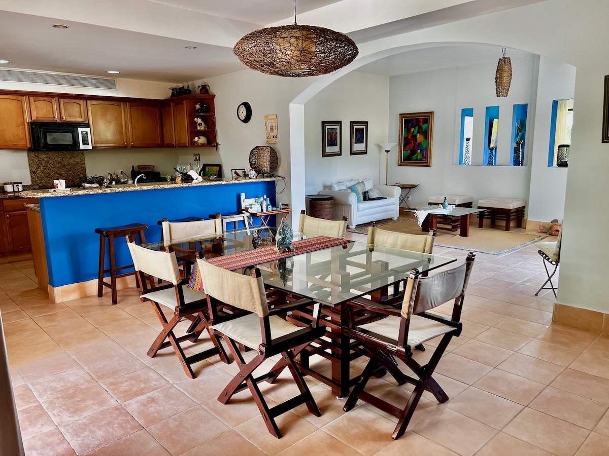 This serene beachfront condo near Playa Blanca offers easy beach access, a large pool, kids’ play area, and covered lounge space. The air-conditioned unit includes a fully equipped kitchen, high-speed Wi-Fi, and a 55” smart TV. Guests can use the tennis court, while essentials are just minutes away. Located on the second floor with elevator access, it’s also close to the Scarlett Martinez International Airport, with 24-hour security for a comfortable and convenient stay.