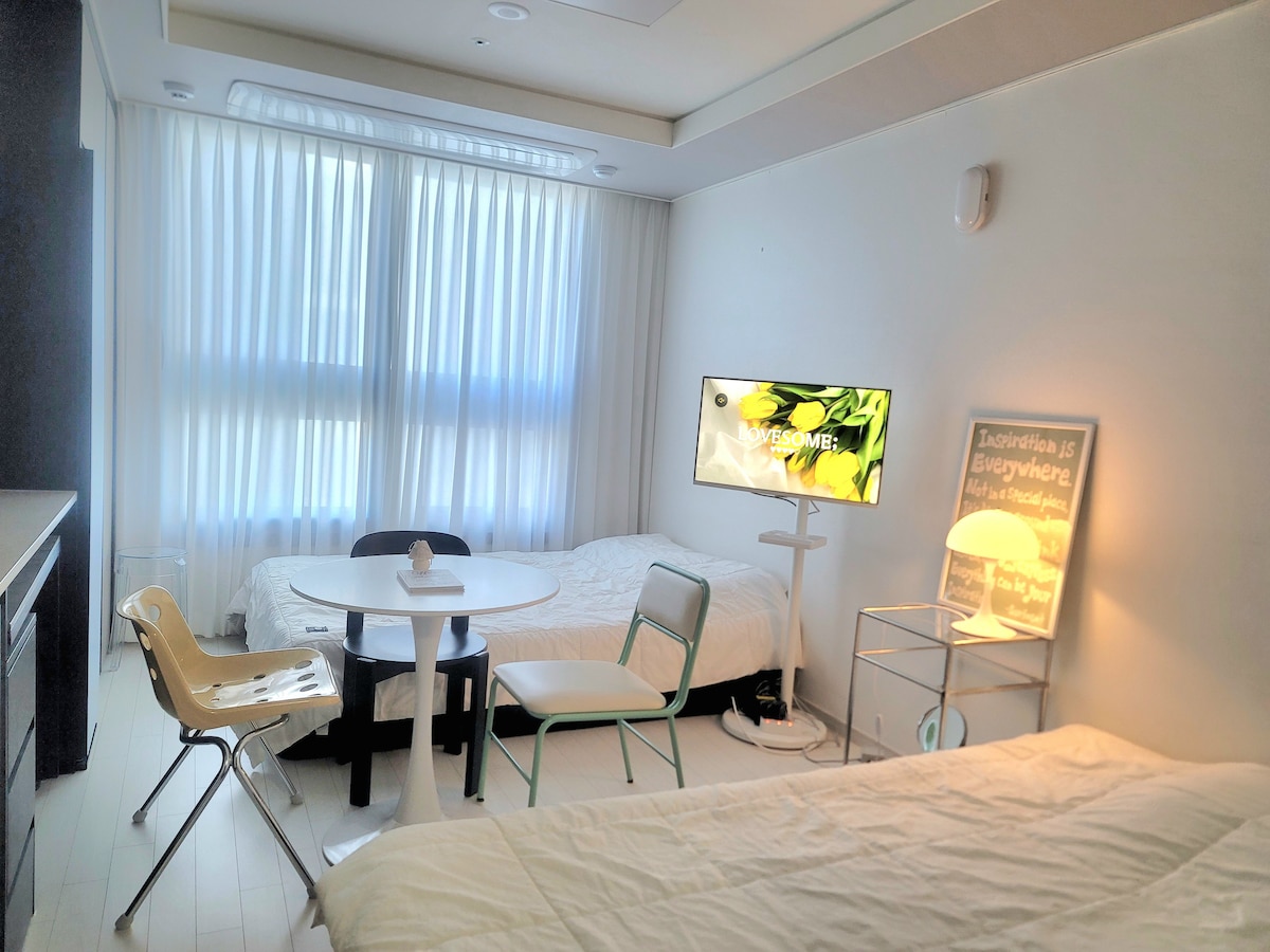 🍀숙소설명을 필독 해주세요🍀 호스트가 직접 관리하는 숙소입니다🩵 매일 방역 및 청결하게 유지하고 있습니다. ✔️체크인 4pm ✔️체크아웃 11am (리뷰이벤트 참여시 호스트와 상의) 📌숙소 옵션 -삼성 스마트 TV -삼성 시스템 에어컨 -초고속 wifi 지원 -삼성 스타일러(스팀기능제외 먼지털이와 건조기능만 가능) -드럼 세탁기 -전자레인지 📌주방 옵션 -인덕션 2구 -머그잔/와인잔 -s접시/m접시 -냄비1개 -조리도구(집게,국자,가위,칼) -수저셋트 📌저희 숙소는 간단한 조리(라면)만 가능합니다‼️ 참고해주세요!!😉🙏 ❌삼겹살,스테이크, 국, 찌개류, 파스타❌ 📌화장실 옵션 -핸드위시 -폼클랜징,클랜징오일 -샴프/컨디셔너/바디워시 -바디로션 -화장솜/면봉 -헤어드라이기 고데기 저희 숙소는 공중 위생관리법(제2조 1항 제2호) 기준을 준수하며 정식"숙박허가"를 받은 숙소입니다.