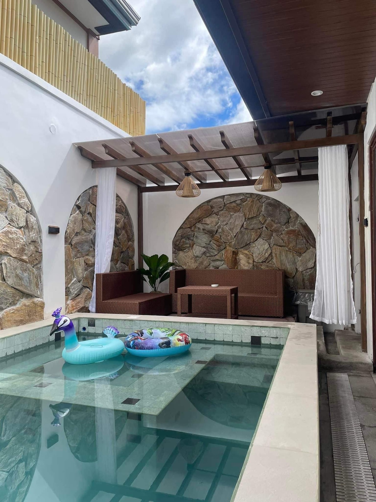 Bali-inspired villa designed for ultimate comfort and fun. Get ready for a perfect mix of relaxation and entertainment. Dive into your own exclusive retreat in the private swimming pool with jacuzzi. The home is fully air-conditioned, including the living room and all bedrooms. It's WFH-ready with unlimited WiFi and a 55-inch Smart TV. You can cook with ease in the fully equipped kitchen and enjoy BBQ nights with the provided griller. You can also enjoy the spacious gazebo and fun karaoke nights