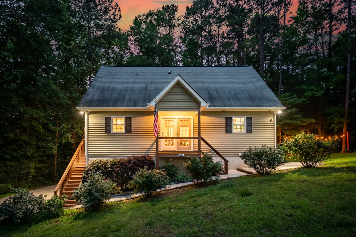 Unwind at this hidden jewel tucked in the woods on Hyco Lake. Forget tiny houses, this “Skinny House” boasts two bedrooms, two baths, a spacious open floor plan, cedar ceilings, fully equipped kitchen, gas grill, solo stove, laundry room. Indoor and outdoor living that is large enough for six adults. Floating dock invites you to spend your days on the lake - swimming, fishing, boating, or just soaking in the views. Canoe, Kayaks, Paddle-boards & life vests provided!