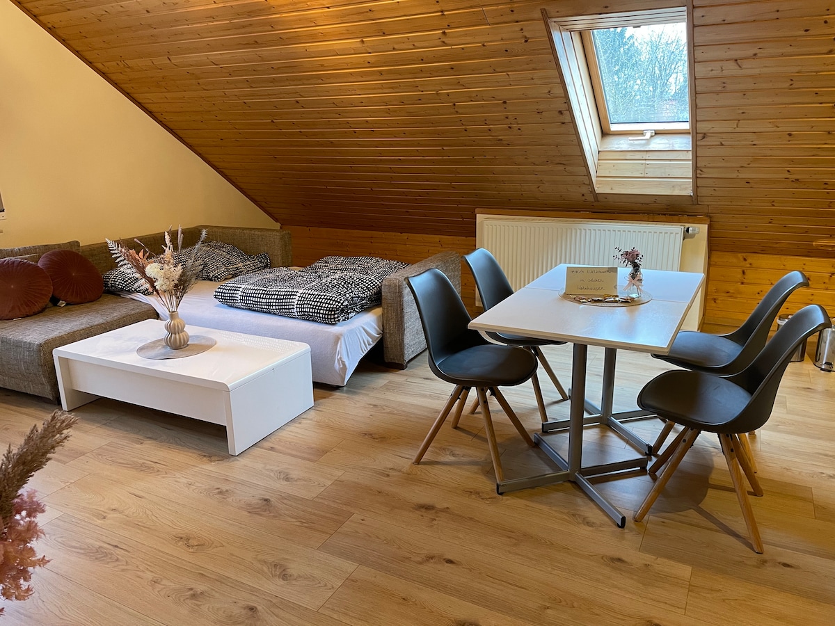 Στο μικρό ξύλινο σπίτι που περιβάλλεται από σπίτια με ξύλινα κουφώματα στο ήσυχο κέντρο του χωριού, μπορείτε να χαλαρώσετε και να απολαύσετε τη φύση της κοντινής Φραγκονικής Ελβετίας. Η οικολογική ξύλινη κατασκευή σε στιλ σοφίτας κάνει το διαμέρισμα μοναδικό. Η θέρμανση γίνεται με ξυλόσομπα. Υπάρχει επίσης ενδοδαπέδια θέρμανση στο μπάνι και στο διπλανό δωμάτιο. Στον προστατευμένο από τα βλέμματα κήπο, θα βρείτε μια σάουνα, ένα ντους με κρύο νερό και μπανιέρα, ξαπλώστρες και τραπεζαρία. Η περιοχή προσφέρει πολλές δραστηριότητες σε εξωτερικούς χώρους.