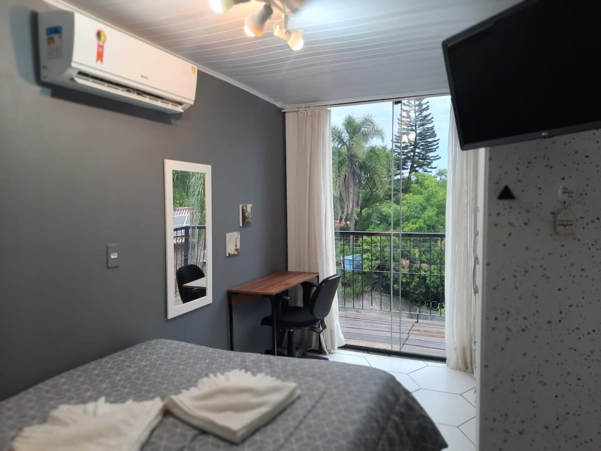 Όμορφος κήπος του Alto Padrão σε προνομιακή τοποθεσία στο υψηλότερο σημείο του Πόρτο Αλέγκρε. Φιλοξενεί έως 4 άτομα. Δεχόμαστε μικρά/μεσαίου μεγέθους κατοικίδια. Διαθέτει πλήρως εξοπλισμένη κουζίνα, διπλό κρεβάτι με επιστρώματα, 2 μονά στρώματα, εξαιρετικά φωτεινό μπάνιο με εξαιρετική ντουζιέρα. Στο μπαλκόνι υπάρχει ένα τραπέζι, 2 καρέκλες, 1 ξαπλώστρα, ομπρέλες. Ο χώρος στάθμευσης περιλαμβάνεται στην τιμή, με δυνατότητα δεύτερης θέσης στάθμευσης (βλ. χρέωση).