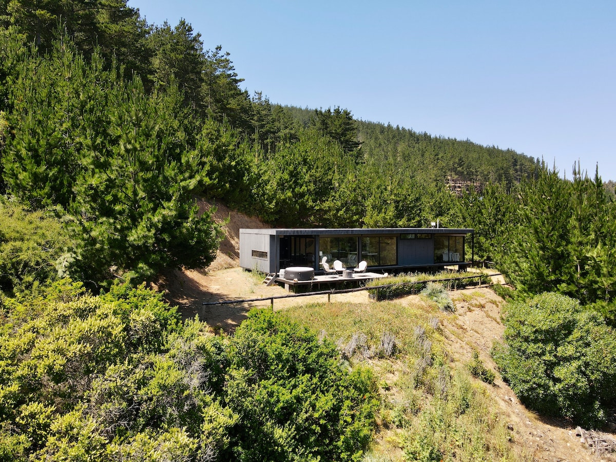 Bienvenidos a nuestra hogar! Te invitamos a pasar una acogedora estadía. La casa tiene una ubicación preferencial, al frente a la playa a dos minutos a pie y una vista panorámica increíble hacia el bosque y una vista despejada al mar y las olas. Sobre las instalaciones, está full equipada para máximo confort, para que disfruten cada segundo de su estadía. Ésta cuenta con 1 pieza, baño, cocina americana, living, parrilla, hot tub, fogón, estacionamiento, wifi, y un agradable sonido del mar.