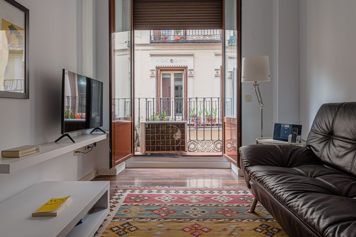 Magnificent 45 square meter apartment in the heart of Madrid. With spectacular design and decoration, spacious areas, and high ceilings, the apartment is equipped with everything you need for your stay in Madrid. The living room has three balconies overlooking the street that provide great brightness to the flat. The bedroom has an en-suite bathroom and a work desk. From the apartment, you can walk to almost all the iconic points of Madrid.