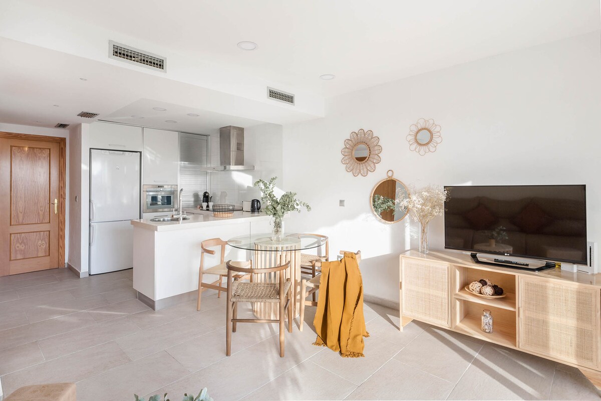 Modern and cozy apartment with all the comforts for 5 people. It is located on the first line just a few meters from the beautiful beach of Muchavista. It has a balcony with beautiful sea views .In the environment you have all kinds of services. Shops and restaurants around. The apartment is located in a quiet area perfect to enjoy throughout the year and it has everything you need to make you feel at home.