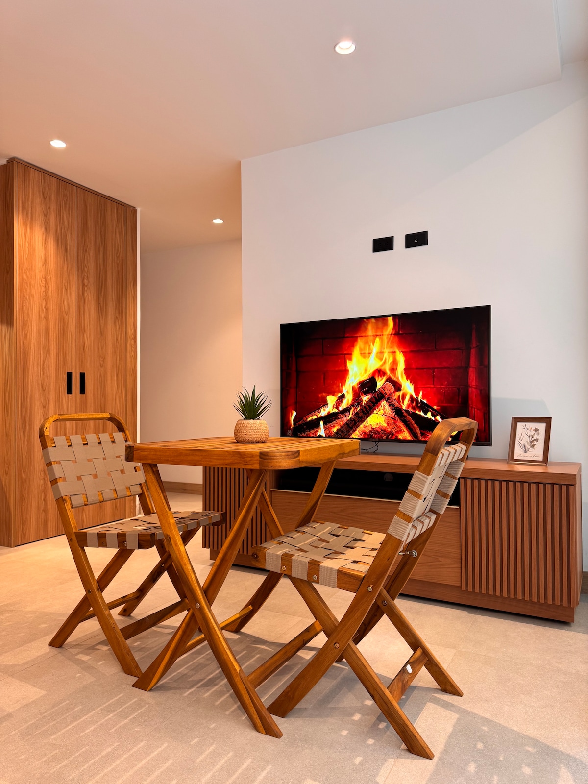 Absorb the warmth and light of open-plan living, with luxurious 9-foot bedroom ceilings, a 20-foot vaulted ceiling with skylight in the common/kitchen area, and oversized windows throughout for a peaceful, quiet, and relaxing stay in Cuenca. ⚡️ 24/7 hot water, Wi-Fi, and electricity for your devices thanks to our grid-tied backup battery system. Note: some high-power appliances like the blow-drier and water kettle do not work during power outages.