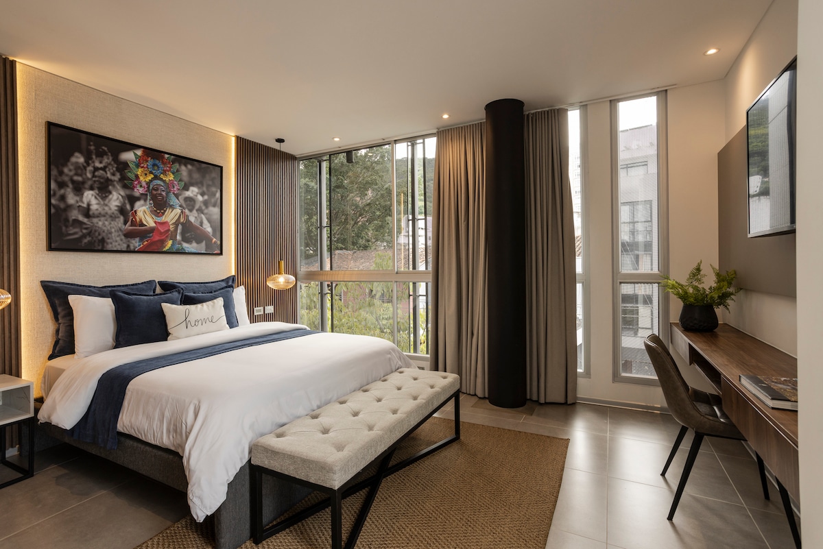 Luxury penthouse studio in Cali’s vibrant Granada district with stunning city views. Ideal for solo travelers or couples. Sleeps up to 3: queen bed, mid-size sofa bed (80x160 cm). Enjoy full kitchen, in-unit laundry, terrace, plus access to pool, gym, spa, coworking, and meeting rooms. Enhance your stay with salsa classes, eco-tours, whale-watching, and optional private chefs, drivers, and massage therapists—all curated just for you. RNT: 251456