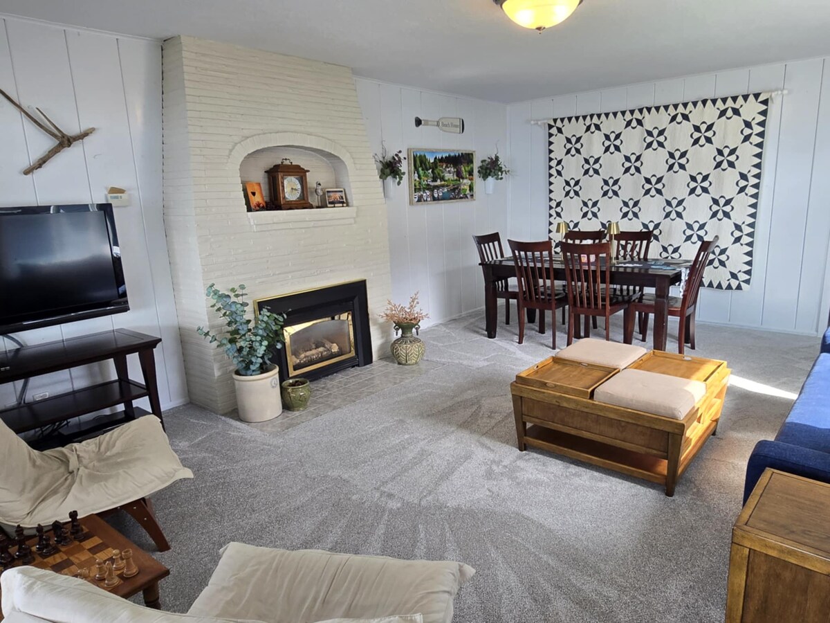 Relax in this renovated 2,900SF 2-story home with panoramic views of Puget Sound and the Cascades. Lots of room for extended family or two families traveling together. Master with queen bed, bath and fireplace. Two more bedrooms with 2 single beds and trundle bed. Den with sofabed. Full kitchen with granite and SS appliances. Gas grill for BBQ. Two gas fireplaces for cool nights. Enjoy the hot tub, rest in the hammock or roast marshmallows in the fire pit. Minutes from parks, beaches and shops.