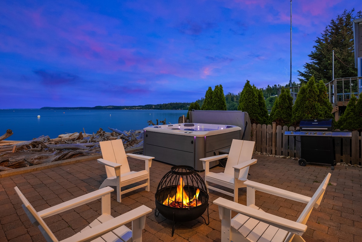 Enjoy breathtaking views of the Sound and Olympic Mountains while relaxing on one of the three decks of our newly remodeled waterfront home. Our modern beach house features three spacious upstairs bedrooms around a separate sitting area, a large living and dining space downstairs, and bathrooms on both levels. You can spot seals, bald eagles, and whales while walking along the no bank beach steps from our front door. Sip wine around the propane fire pit while enjoying the magnificent sunset.