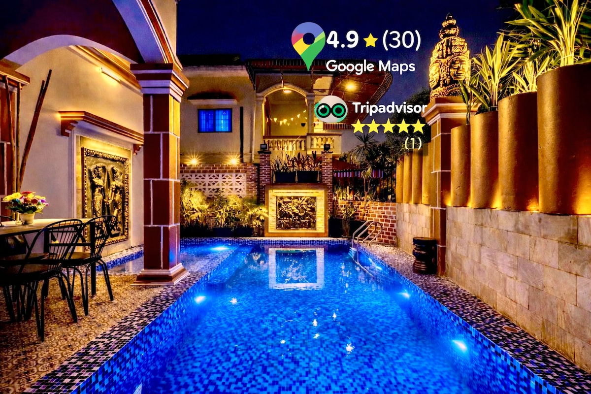 Ένα ευρύχωρο μπουτίκ σπίτι 5 υπνοδωματίων με ιδιωτική πισίνα, χτισμένο σε ένα μοναδικό στυλ αρχιτεκτονικής Khmer και δυτικής αρχιτεκτονικής με μια ατμόσφαιρα όασης, που βρίσκεται κοντά στη μεγαλύτερη τοπική αγορά του Siem Reap, μόλις 10 λεπτά από το κέντρο της Pub Street και 15 λεπτά από το θαυμάσιο Angkor Wat. Αυτή η όμορφη βίλα είναι ιδανική για μια ομάδα ή μια οικογένεια να απολαύσει μια ιδιωτική διαμονή και να νιώσετε σαν να είστε στο σπίτι σας. Κατά τη διάρκεια της διαμονής, θα μπορούσαν να κανονιστούν αυθεντικά γεύματα Khmer, μεταφορά/ξενάγηση και μεταφορά από το αεροδρόμιο.