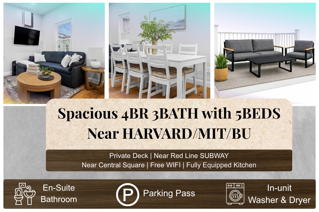 Πολυτελές & ευρύχωρο 4 υπνοδωμάτια/ 4 πλήρη μπάνια με 3 θέσεις στάθμευσης! 2 λεπτά με τα πόδια από τον σταθμό Porter Square T (κόκκινη γραμμή)! 10 λεπτά με τα πόδια από το Χάρβαρντ! Καταχώρηση που περιλαμβάνει 4 υπνοδωμάτια, 4 πλήρη μπάνια και ένα μικρό δωμάτιο ανάγνωσης. 2 λεπτά με τα πόδια από το εμπορικό κέντρο Porter Square, το Star Market, το CVS, τα Starbucks. Ολοκαίνουργια κουζίνα, τραπεζαρία και νέο πλυντήριο και στεγνωτήριο! Μπορείτε να αποκαλέσετε αυτό το μέρος σπίτι σας!
