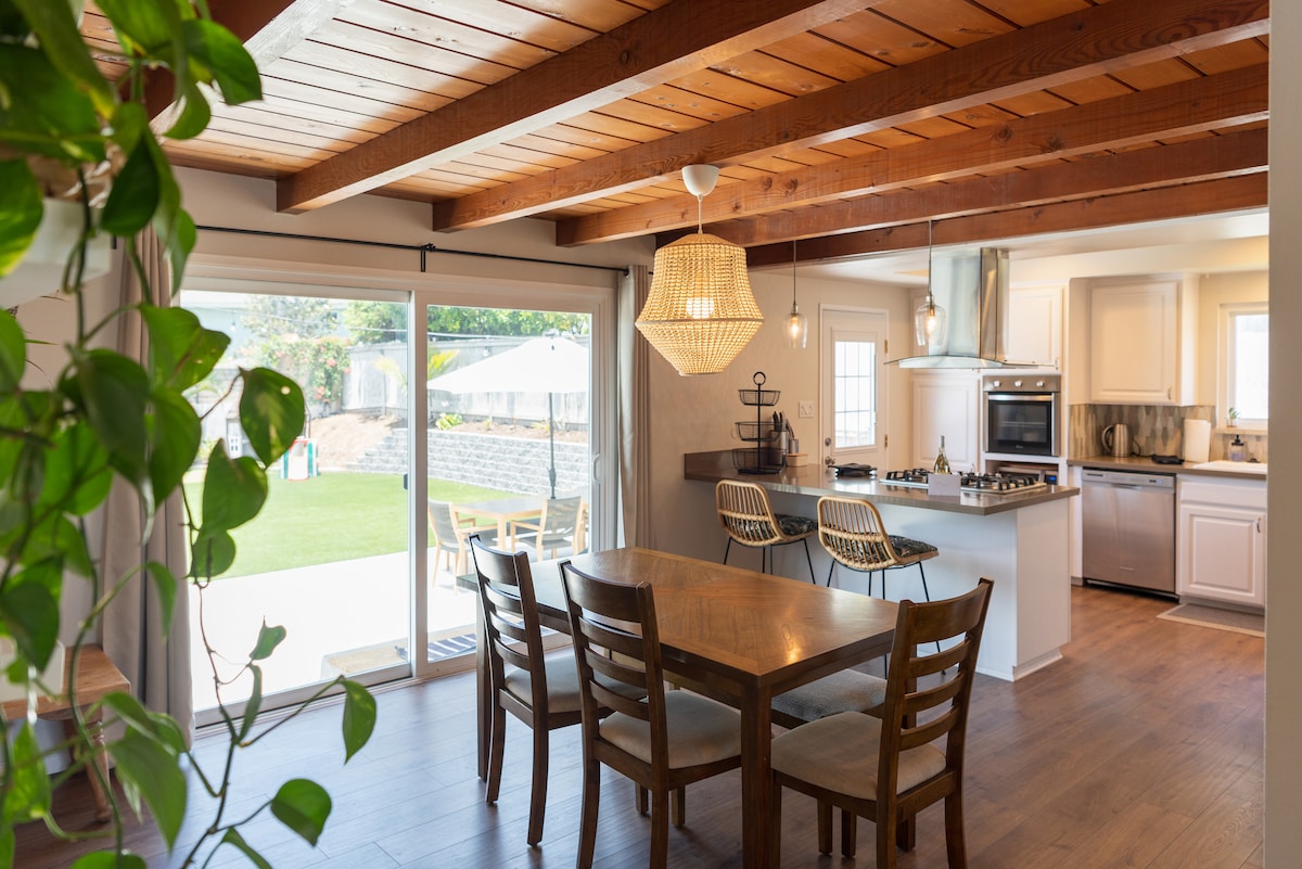 Your perfect home away from home to enjoy all that sunny Oceanside has to offer! Only 4 miles to beach, harbor & downtown w/restaurants, shops & cafes and 9 miles to Legoland. Spacious cozy home with central AC in a quiet neighborhood. Open concept living and a beautiful backyard are ideal for a group or family vacation. The stunning kitchen is stocked with all you need to enjoy a meal together. Family friendly amenities: highchair, pack-n-play, baby bath, toys, arcade, ping pong and playground.