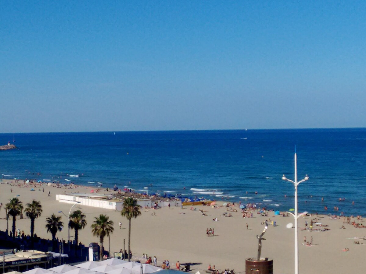logement entier, situé en plein centre de la station sur la place Méditerranée, au 5ème étage (avec ascenseur) Appartement de 45 m2 + terrasse 8m2. Vue mer imprenable. Cuisine avec lave vaisselle, réfrigérateur /congélateur, micro onde / four machine à café classique et nespresso Salon avec canapé et fauteuil, TV. Chambre avec lit de 140 et autre pièce de 8,80m2 avec lits superposés. Salle d eau avec lave linge, wc séparés. Draps et serviettes de toilettes non fournis Possibilité de garage