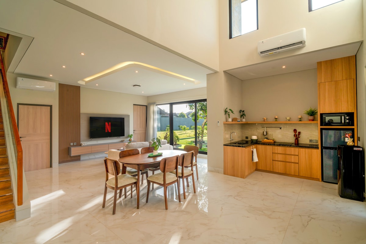 Its A New Build, A stylish, minimalistic villa with industrial style located in Most Interesting Area, North Yogya. This villa comprises of two bedrooms with Air-con, where the main bedroom upstairs is completed with an industrial-styled bathroom as well as comforting bath-up. Second bedroom is located on the first floor with a separated bathroom. And also completed with a kitchen, living room balcony along with backyard. And from the balcony you can see rice fields and watch the sunset 😇