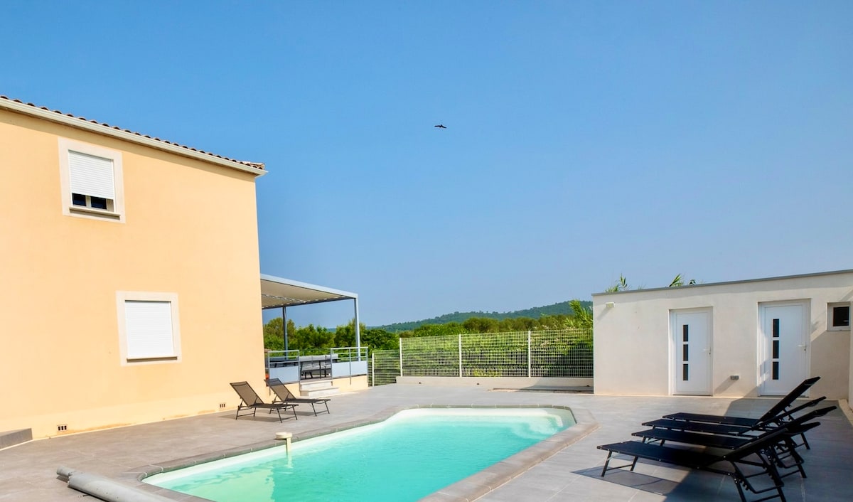 Relax in this charming and well-appointed country house, set against the hills, featuring a five-person spa integrated into a wooden terrace and a small, landscaped 250 m² garden. Ideally located between Nîmes, Alès, and Montpellier, this lovely home offers direct access to hiking and mountain biking trails. Guests particularly appreciate its insulation, decor, and amenities.