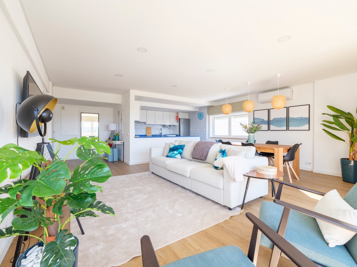 Apartamento reconstruído por arquitecto, excelente privacidade, exposição solar, com wifi, e praia a 150m. 1 suite com SPA e banho turco com aromaterapia. 1 suíte com terraço com vista mar, tela de projeção de cinema. Sala com vista de mar, rio, e terraço, onde poderá disfrutar de uma zona de estar e de um barbecue com grelha em ferro forjado. Perto de restaurantes, cafés e supermercado, e estação de comboio. Ar condicionado e piso aquecido em todas as áreas, TV 4K e box independente por suíte.