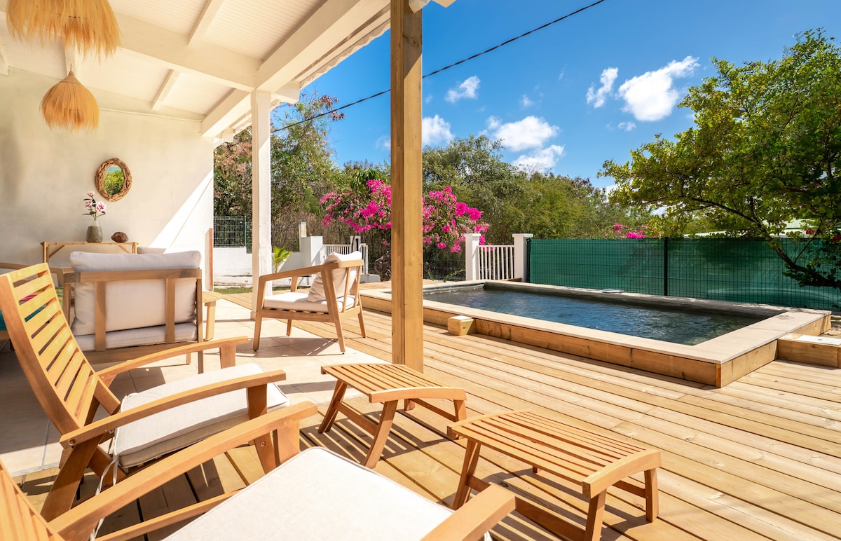 Χαλαρώστε σε αυτήν τη βιοκλιματική κρεολική βίλα από κόκκινο ξύλο, με κλιματισμό και φωλιασμένη σε έναν μεγάλο δασώδη και ανθισμένο κήπο και απολαύστε την ηρεμία, δίπλα στην πισίνα. Απολαύστε το πρωινό σας στο μεγάλο τραπέζι στη βεράντα, ενώ ατενίζετε την απέραντη Καραϊβική Θάλασσα και αναπνέετε το απαλό άρωμα του ylang ylang... Το βράδυ, χαλαρώστε στο άνετο σαλόνι που ανοίγει στη βεράντα. Πλήρως εξοπλισμένη κουζίνα, 3 κλιματιζόμενα και αεριζόμενα υπνοδωμάτια, 2 μπάνια, 2 τουαλέτες...