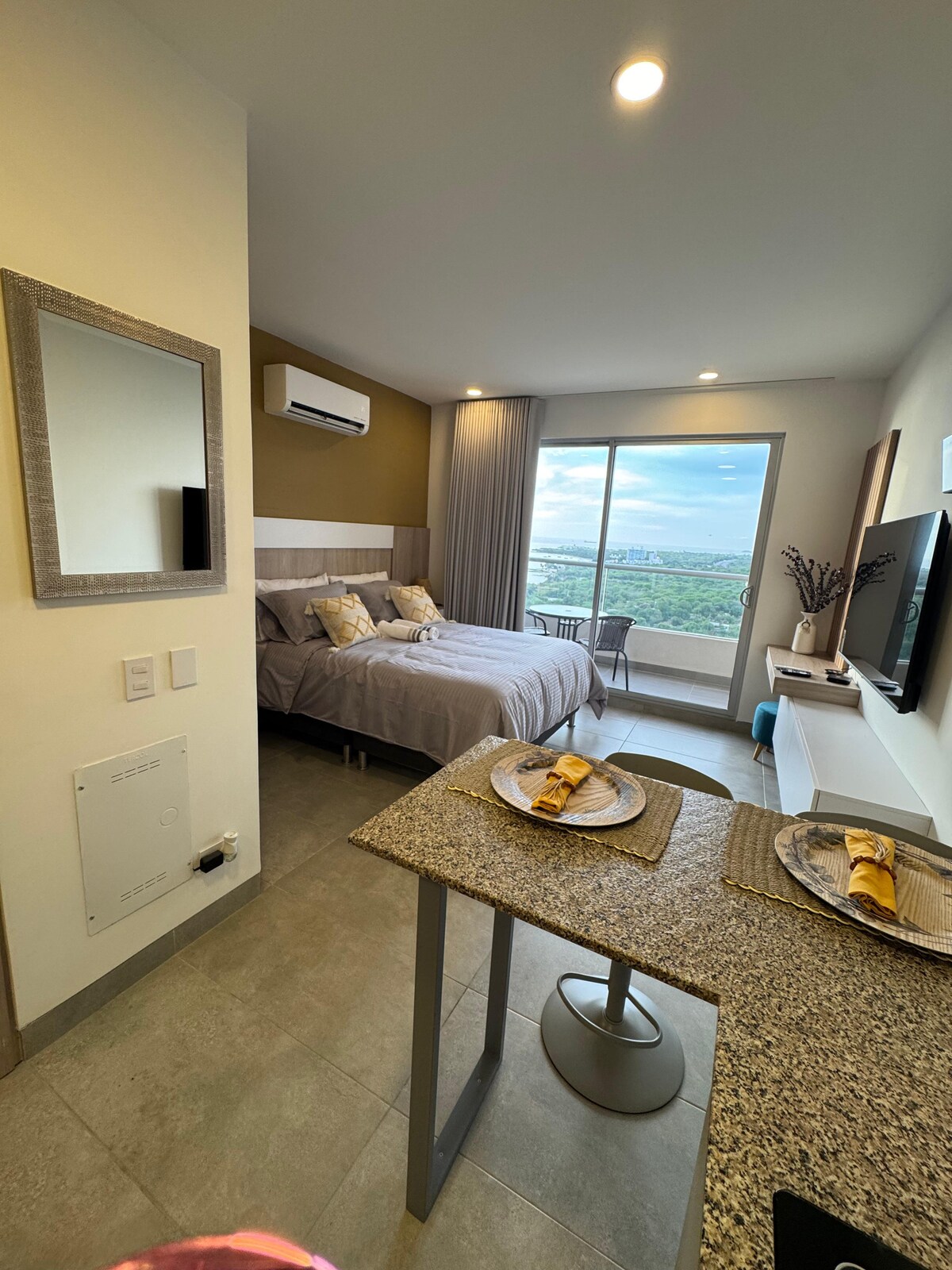 Απολαύστε αυτή τη μοντέρνα σοφίτα στον 16ο όροφο με εκπληκτική θέα που θα σας συνοδεύει ανά πάσα στιγμή της ημέρας και της νύχτας. Φωτεινός, φρέσκος και τέλεια διαμορφωμένος χώρος, ιδανικός για ζευγάρια ή ταξιδιώτες που αναζητούν άνεση και στυλ. Διαθέτει εξοπλισμένη κουζίνα, άνετο κοινόχρηστο χώρο και χαλαρωτική ατμόσφαιρα για να ξεκουραστείτε μετά από μια μέρα στην παραλία ή στα αξιοθέατα. Ένας χώρος σχεδιασμένος για να αποσυνδεθείτε και να απολαύσετε μια αξέχαστη διαμονή.