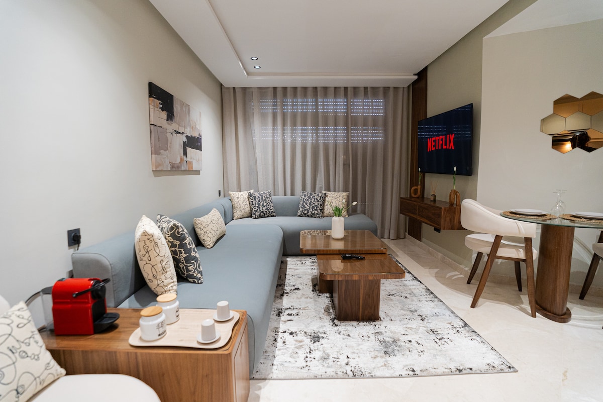 Welcome to your modern apartment in the heart of Casablanca Finance City (CFC) in BO52 residence. Perfect for tourism and business trips. This luxury fully-equipped home features: -WiFi & IPTV -Private gym -Spacious dual aspect terrace -Central A/C & heating -Fully equipped kitchen -Free secured parking -Tram & transport access Prime location: facing Aeria Mall and Anfa Park, 10 minutes from Ain Diab beaches . Secure, prestigious neighborhood for an unforgettable stay in Casablanca.