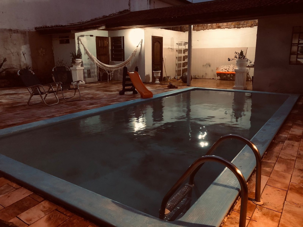 Esqueça de suas preocupações neste lugar espaçoso e tranquilo. Temos espaço de lazer com piscina e churrasqueira, 1 suíte e mais 1 quarto, sala com pé direito duplo possuindo tv e sofá cama, mesa de jantar, fogão, pia de cozinha, geladeira e utensílios. A casa hospeda até 15 pessoas, sendo necessário mínimo de 2 pessoas por hospedagem. Ou se for ficar sozinha, o valor fica referente a duas pessoas.