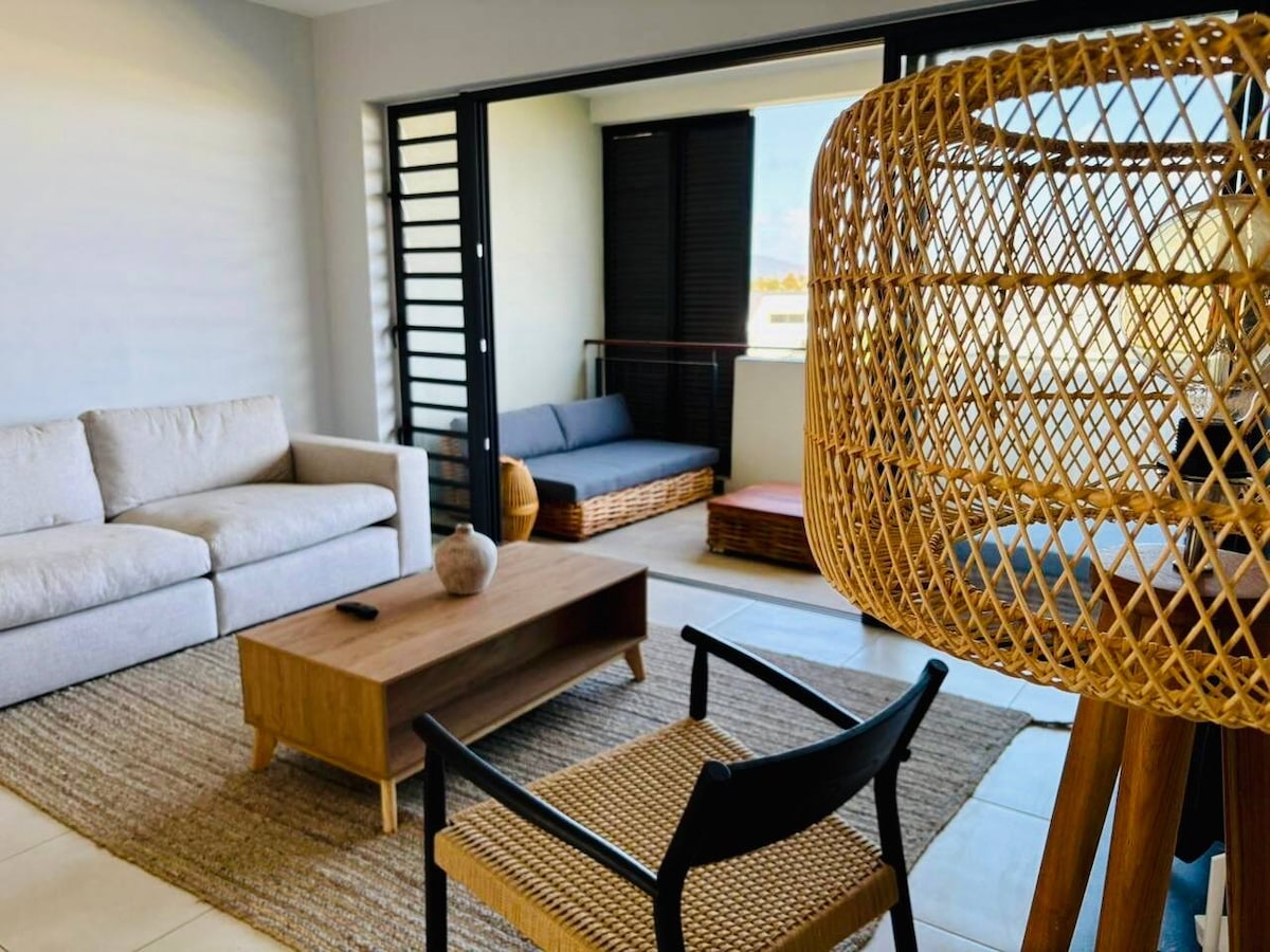 Enjoy a stylish experience at this centrally-located place in Flic-en-Flac which has the best climate in Mauritius. The apartment is located on the first floor of a newly built complex within a private estate. There are 3 bedrooms with king beds, a master ensuite, main bathroom with bathtub, fully equipped kitchen. There is a communal swimming pool with loungers. The apartment benefits from air conditioning throughout. There is a terrace overlooking the swimming pool and a rooftop.