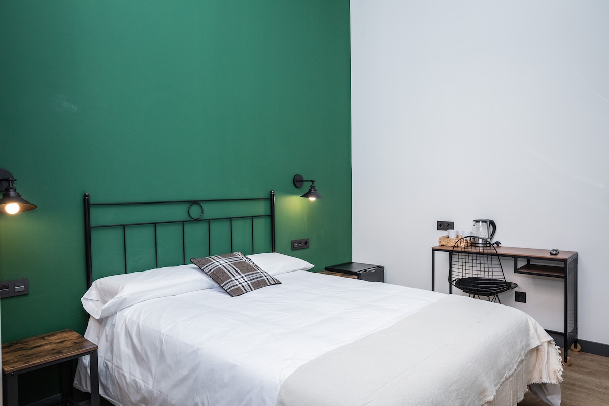 Δίκλινο δωμάτιο με ιδιωτικό μπάνιο στην Iturriaga ostatua, ένα γοητευτικό κατάλυμα, το οποίο διαθέτει κοινόχρηστη μικρή κουζίνα, με ψυγείο και καφετιέρα και αυτό το άνετο δωμάτιο , ιδανικό για να απολαύσετε τη διαμονή σας στο Μπιλμπάο και μόλις 1 λεπτό από τη στάση του μετρό.