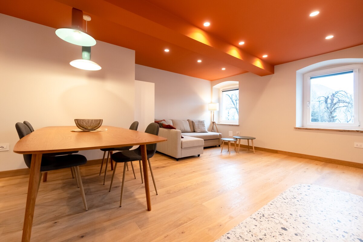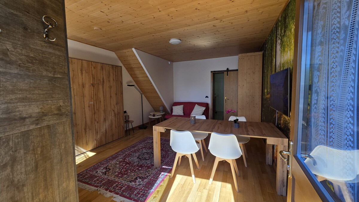 The independent entrance, with external stairs and an elevator, leads to the first floor where the Silence apartment is. It has three rooms with double beds and one with two French beds, all with private bathrooms. The loggia, balconies, and large windows offer views of the landscape, creating harmony between nature and interiors. The equipped kitchen with a large table and tiled stove is the heart of the home. In the attic, the living room provides a cozy space to relax in tranquility.