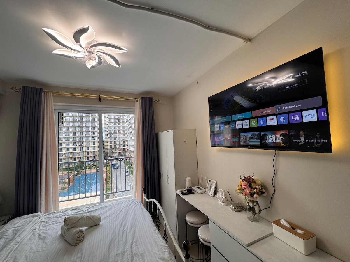 Comfy, accessible, and aesthetic condo studio unit near Mactan Cebu International Airport 24 sqm condo unit with balcony Oceanview with Queen-sized bed • can fit 4-6 pax • extra foam mattress and extra blanket provided • free pool access for 2, paid parking inside Bathroom with: • shower, heater, bidet • shampoo | conditioner | body gel provided • towels Entertainment • 200 mbps internet connection • 1080p 4K Smart Projector with surround sound • Mini karaoke • Card and board games
