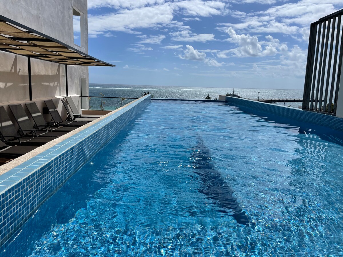 Estudio en edificio frente al mar en Puerto Morelos, dentro del exclusivo Distrito Puerto. Disfruta de acceso directo a la playa, alberca en el rooftop con vista al Caribe, gimnasio con vista al mar, wifi de alta velocidad y seguridad 24/7. Ideal para parejas o viajeros que buscan tranquilidad, confort y conexión con el mar a pocos minutos en taxi del centro de Puerto Morelos. *Te recomendamos moverte en taxi, ya que el edificio no cuenta con estacionamiento disponible