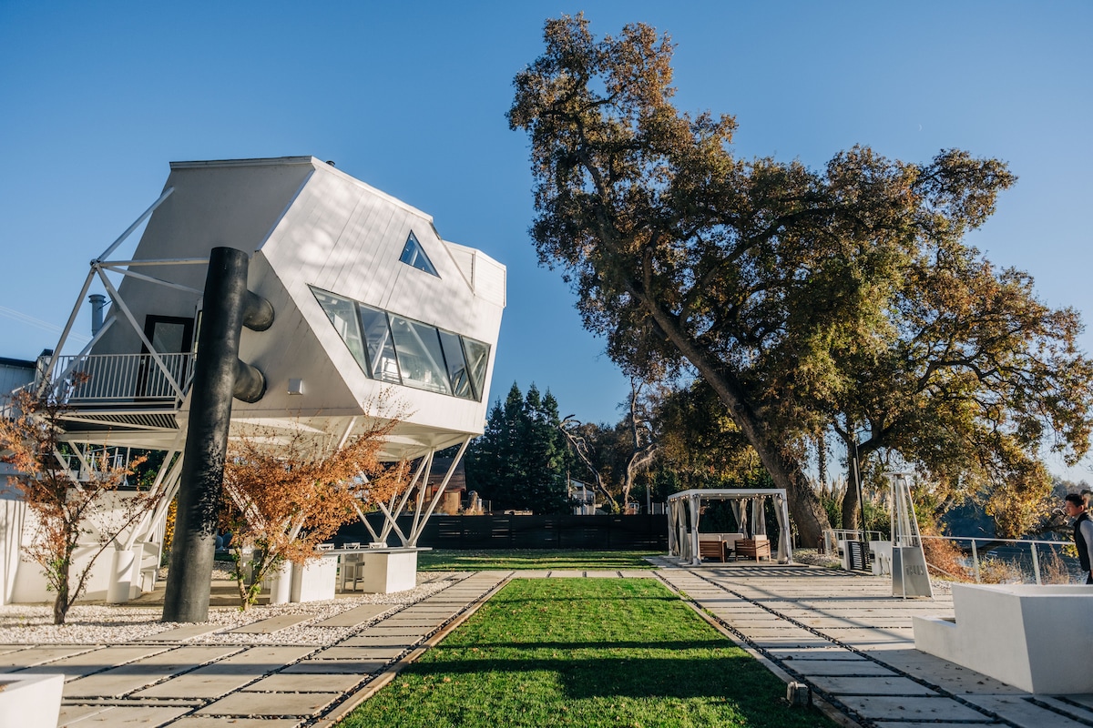 Ξυλόσπιτο και σκηνή σε αμπελώνα