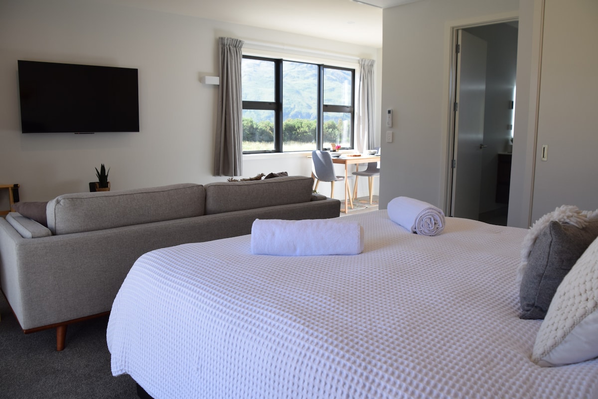 Με θέα την πλατεία Fergus, το κατάλυμά μας είναι πρόσφατα ανακαινισμένο και διακοσμημένο. Οι συρόμενες πόρτες ανοίγουν σε μια σκεπαστή βεράντα για χαλάρωση σε εξωτερικό χώρο. Πλήρως μονωμένο και με αντλία θερμότητας, θα είστε ζεστοί και άνετοι ανεξάρτητα από τον καιρό. Μόλις λίγα λεπτά με τα πόδια από τη λίμνη και 5 λεπτά με τα πόδια από καταστήματα, καφετέριες και μπαρ, η τοποθεσία είναι ιδανική! Όμορφη λίμνη, θεαματικά βουνά και εύκολα προσβάσιμα μονοπάτια πεζοπορίας. Ανυπομονούμε να μοιραστούμε το Te Anau μαζί σας.