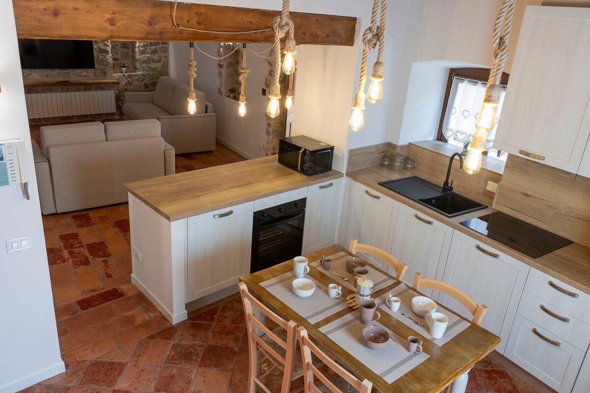 η βίλα χωρίζεται σε δύο διαμερίσματα, στο δεξί στο ισόγειο βρίσκεται η κουζίνα που περιλαμβάνει όλα όσα χρειάζεστε για το μαγείρεμα, φούρνο μικροκυμάτων και πλυντήριο πιάτων, το σαλόνι με το τζάκι και τη σόμπα ξύλου που θα σας κρατήσει ζεστούς, από το σαλόνι έχετε πρόσβαση στο μπαλκόνι και στο βοηθητικό κτίριο με θέα στον κήπο και το ιδιωτικό δάσος, ιδανικό για να απολαύσετε το πρωινό σας με τις ακτίνες του ήλιου που σας ζεσταίνουν. Στον πρώτο όροφο υπάρχουν δύο υπνοδωμάτια με διπλό ή δύο μονά κρεβάτια και ένα μπάνιο με μπανιέρα.