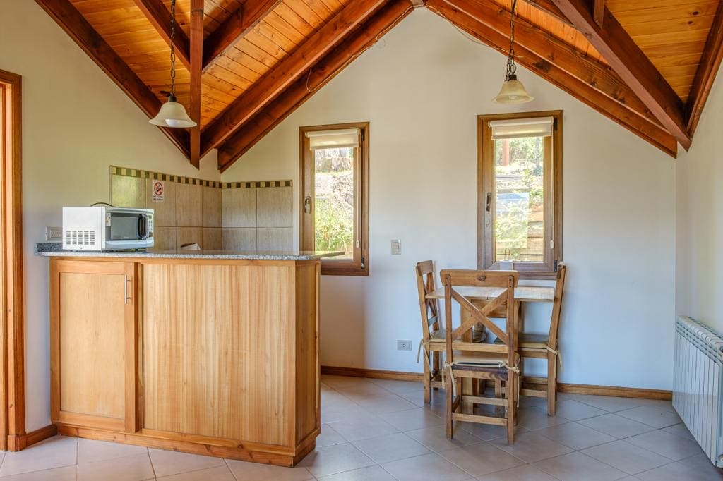 Cálida cabaña de estilo rústico a orillas del lago Nahuel Huapi con hidromasaje, hogar a leña, y deck. Monoambiente creado para el relax y el romanticismo con vista al amanecer y salida de la luna sobre el lago. Smart TV e internet por FIBRA OPTICA con wifi para trabajar. Una kitchinette con todo lo necesario, incluyendo cafetera dolce gusto. Caja de seguridad para resguardar tus notebooks al ir de paseo. Baño completo. Pool, ping-pong. Playa: Kayak y standup paddle. Desayuno continental.