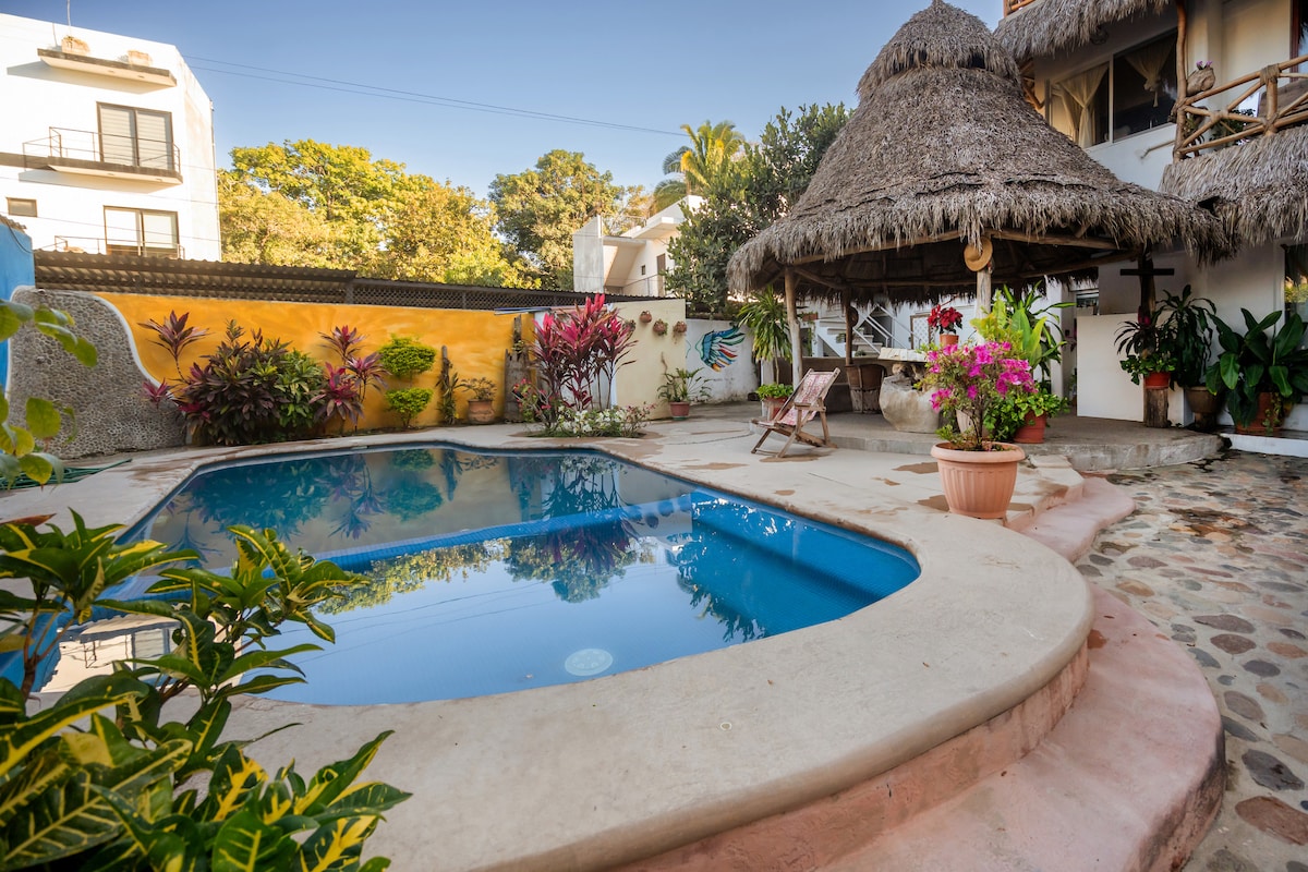 ΡΟΥΣΤΙΚ ΥΠΑΙΘΡΙΑ ΣΟΦΙΤΑ PALAPA, ασυναγώνιστη θέα, χωρίς κλιματισμό ή σήτες, τροπική ζούγκλα. 2 λεπτά με τα πόδια από μια μεγάλη ήσυχη παραλία. Καρέκλες/ομπρέλα παραλίας, wifi, υπηρεσία καθαριότητας, χρηματοκιβώτιο, κοινόχρηστη πισίνα με τζακούζι, κάμερες ασφαλείας, LR, μπαρ, μικρή κουζίνα, μπάνιο/ντους, 2η σοφίτα, κατοικίδιες γάτες. Υπνοδωμάτιο με διπλό κρεβάτι. Κουνουπιέρα, ανεμιστήρες, αεράκι του ωκεανού, σπρέι εντόμων. 6 λεπτά με τα πόδια στην παραλία ή στο δρόμο για εστιατόρια. Αν είναι ευαίσθητα στα έντομα, σκεφτείτε τη σουίτα της Calabaza στην Αφρική με κλιματισμό, σήτες και πόρτες.