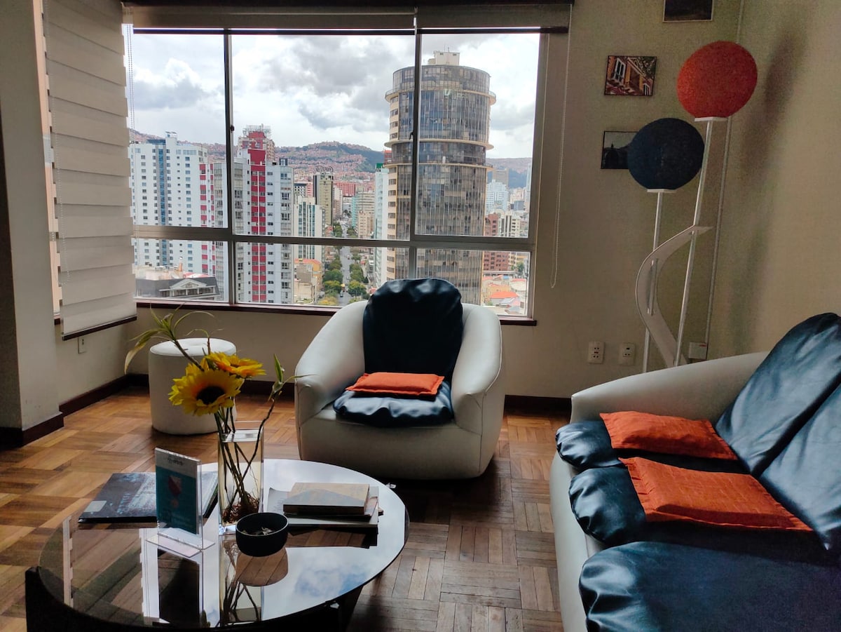 ✨ Stylish Apartment in Sopocachi 🏙️ Wake up to stunning city views in this elegant and cozy apartment. Nestled in the heart of Sopocachi—steps from embassies, cafes, and vibrant plazas—it's the perfect spot to experience La Paz like a local. its design combines comfort, harmony, and a cultural charm.. Perfect for travelers and digital nomads seeking both inspiration and relaxation.