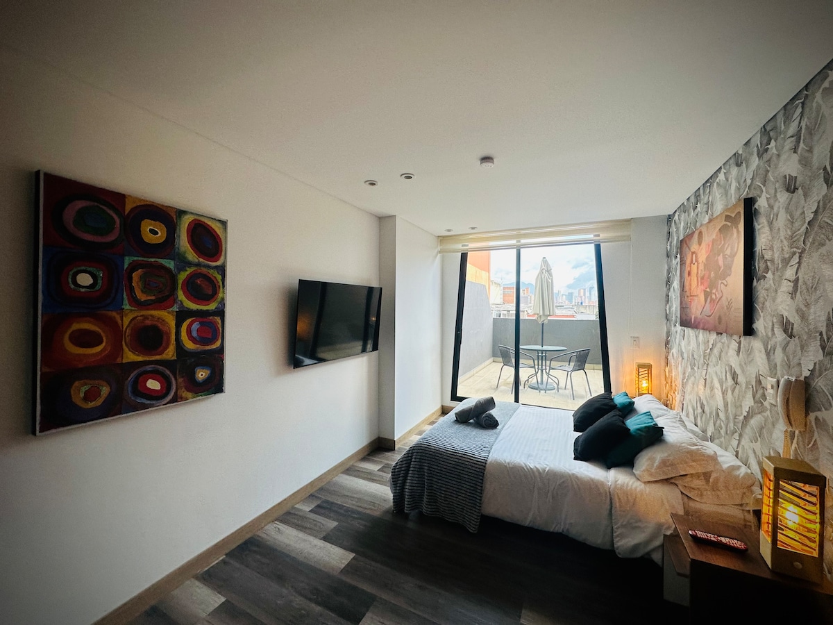 Ένας κομψός, ολοκαίνουργιος χώρος διαμονής, απόλυτα άνετος για ένα μικρό ή μεγάλο χρονικό διάστημα. Έχει σαφώς όλα όσα μπορεί να χρειαστείτε για να έχετε μια μοναδική και αξέχαστη εμπειρία με θέα τα όμορφα βουνά και τη θέα της Μπογκοτά κατά τη διάρκεια της ημέρας και της νύχτας. Ένα υπέροχο διπλό κρεβάτι, ένας καναπές-κρεβάτι, εξαιρετικό μπάνιο, και για όσους αρέσει να μαγειρεύουν, έχει όλα τα είδη των συσκευών για να διευκολύνει. Κοντά θα βρείτε τα καλύτερα κλαμπ όπως το Theatron, μεταξύ πολλών άλλων, μπαρ και σημεία για ψώνια.