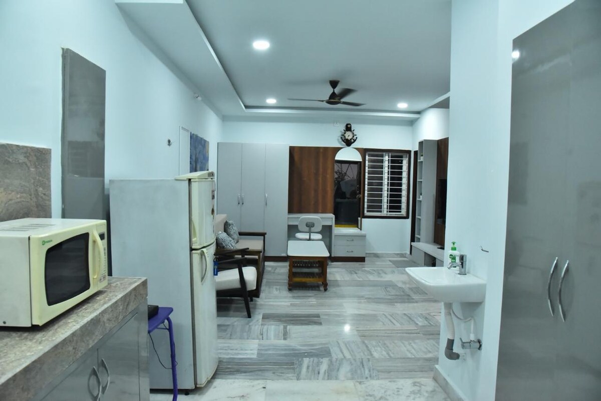 Ένα στούντιο προσεκτικά σχεδιασμένο από εμένα, που προσφέρει απόλυτη κομψότητα και λειτουργικότητα, που σας κάνει να νιώθετε σαν στο σπίτι σας και άνετα. 24 ώρες άνδρας/γυναίκα φύλακας Σύντομος περίπατος: ΕΣΤΙΑΤΟΡΙΑ Στάσεις λεωφορείων Είστε απλώς: 15 λεπτά - HYD City Centre 19 λεπτά - Αεροδρόμιο (RGIA) 26 λεπτά - Hitech City / Financial Dist. / US Emb Η διαμονή σας περιλαμβάνει: Πάρκινγκ Σνακ Κρύα/ζεστά ροφήματα Πετσέτες Ιδιωτικό μπάνιο Θερμοπίδακας Απαγορεύονται τα έντομα Υπηρεσία καθαριότητας Ψυγείο Ηλεκτρικός βραστήρας Κλιματιστικό 24ωρη εφεδρική ηλεκτρική ενέργεια