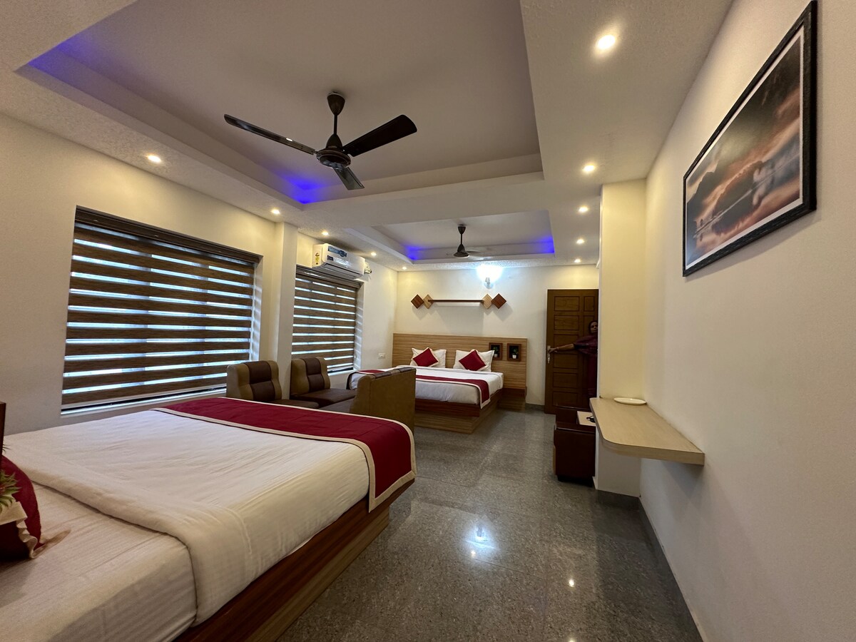 Samudhra Apartments: Premium AC 1 BHK apartment just 700m from Guruvayoor Temple. Enjoy a spacious king-bed room, TVs in hall and bedroom, a fully equipped kitchen with fridge, washing machine, induction stove, kettle, and utensils. Relax in the cozy living area with L-shaped sofa, dining table, a double cot and private balcony. — Includes fast Wi-Fi, 24/7 hot water, —Easy access to Restaurants, shops, and Railway station — A total of 4 adults and 2 children can be accommodated comfortably.