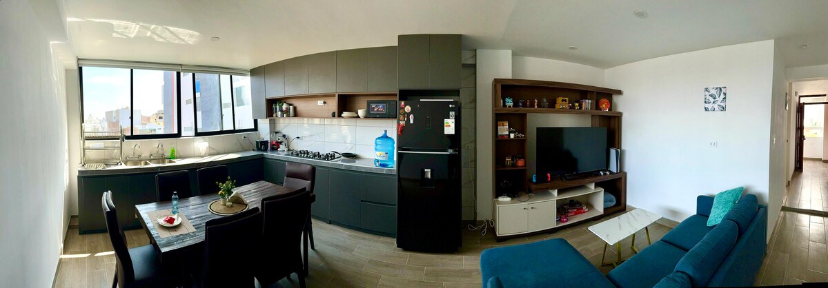 Διαμέρισμα για πρώτη φορά, άψογο, ευρύχωρο, άνετο και πολύ καλά φωτισμένο. Βρίσκεται στον ΤΡΙΤΟ ΟΡΟΦΟ με θέα στον δρόμο. Απολαύστε την αποκλειστικότητα αυτού του ήσυχου και κεντρικού καταλύματος. Βρίσκεται 5 λεπτά από το αεροδρόμιο, την Real Plaza, το Paseo Las Musas, το Paseo Yortuque, την Plaza de Armas. Στη διεύθυνση όπου θα μείνετε, υπάρχουν κοντά οινοποιεία, εστιατόρια και φαρμακεία. Περπατώντας μπορείτε να φτάσετε στο Paseo Yortuque, ένα τουριστικό πάρκο με φιγούρες που αναπαριστούν την ιστορία του Λαμπαγιέκ