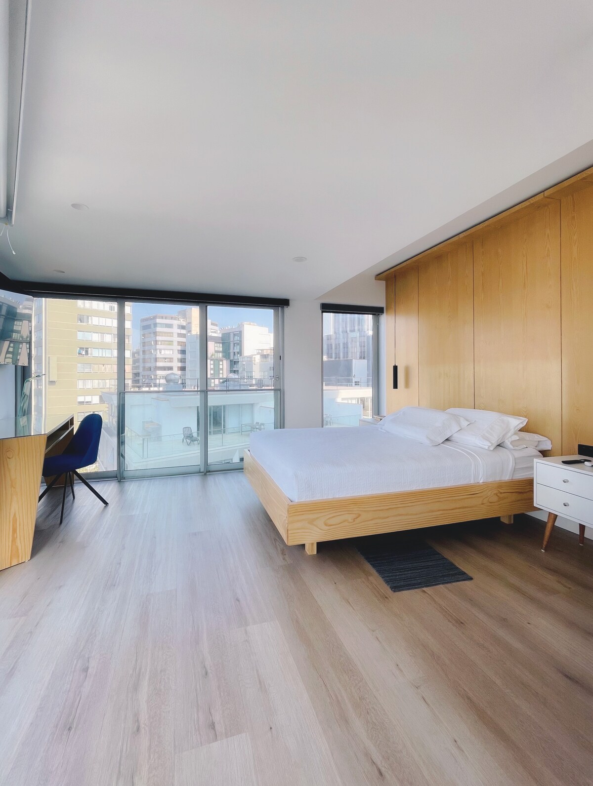 Departamento amplio y elegante en el corazón de Barranco. Ubicación privilegiada: A pasos de los principales puntos turísticos de Barranco y Miraflores, de los mejores restaurantes, bares y galerías de arte. Dormitorio principal: Cama king-size y gran walking closet. Espacio abierto y luminoso: Sala de estar y kitchenette con luz natural. Cochera privada: sujeta a disponibilidad Áreas comunes: Gimnasio, ambiente para reuniones y area de juego para niños. Estilo minimalista.