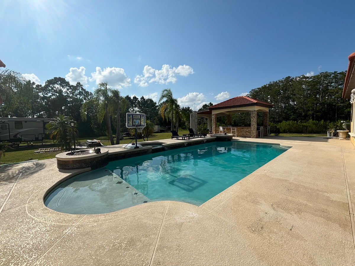 Απολαύστε τη ρουστίκ κομψότητα αυτού του όμορφα ανακαινισμένου αχυρώνα 1.800 τετραγωνικών ποδιών που βρίσκεται σε ένα γαλήνιο κτήμα 17 στρεμμάτων. Χαλαρώστε στο ιδιωτικό θερμαινόμενο τζακούζι και απολαύστε το ήσυχο περιβάλλον. Η προνομιακή τοποθεσία προσφέρει εύκολη πρόσβαση σε σημαντικά αξιοθέατα. Μόλις 35-45 λεπτά με το αυτοκίνητο δυτικά θα σας μεταφέρει στα πάρκα Disney, Universal, SeaWorld και Gator, ενώ 45-60 λεπτά με το αυτοκίνητο ανατολικά σας οδηγεί στις μαγευτικές παραλίες του Ατλαντικού και στην Ακτή του Διαστήματος. Επιπλέον, η ιδιοκτησία απέχει μόλις 40 λεπτά από το αεροδρόμιο