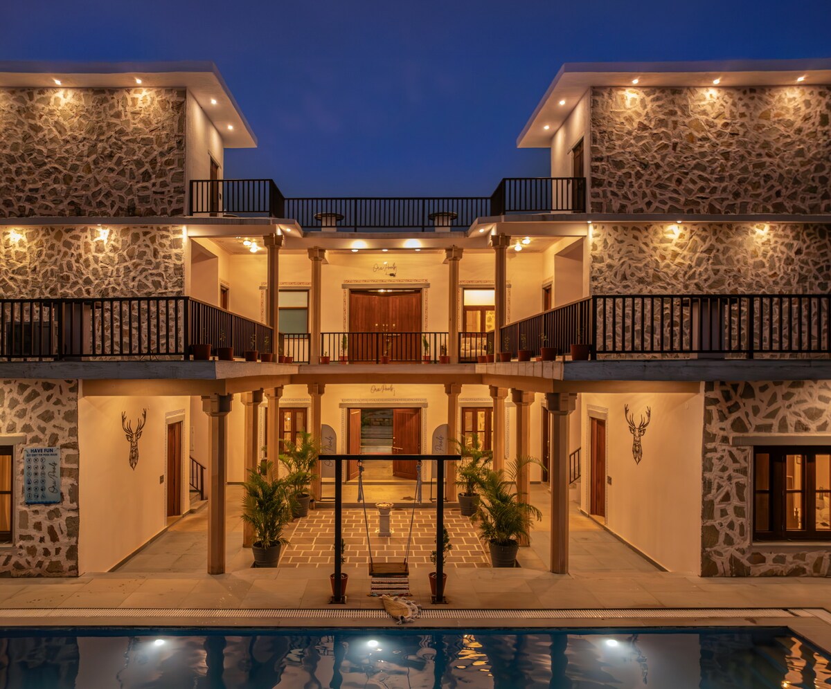 Η βίλα μας με τα 7 υπνοδωμάτια, η οποία βρίσκεται στην αγκαλιά της οροσειράς Αραβάλι, είναι ένα μικροσκοπικό θέρετρο, ιδανικό για μια μεγάλη παρέα 20 ατόμων. Κάθε βίλα, η οποία αποτελείται από 3 ανεξάρτητες μονάδες, διαθέτει δική της ιδιωτική πισίνα με κιόσκι, προσφέροντας στους επισκέπτες την ελευθερία να απολαμβάνουν την ιδιωτικότητά τους. 2 από τις 3 μονάδες διαθέτουν ευρύχωρους χώρους διαβίωσης. Κάθε υπνοδωμάτιο διαθέτει ιδιωτικό μπάνιο που προσφέρει μια απολαυστική εμπειρία μπάνιου. Υπάρχουν δύο υπαίθριες μπανιέρες, 1 κλειστό και 2 εξωτερικά ντους που χαρίζουν μια αίσθηση θέρετρου στη διαμονή σας.