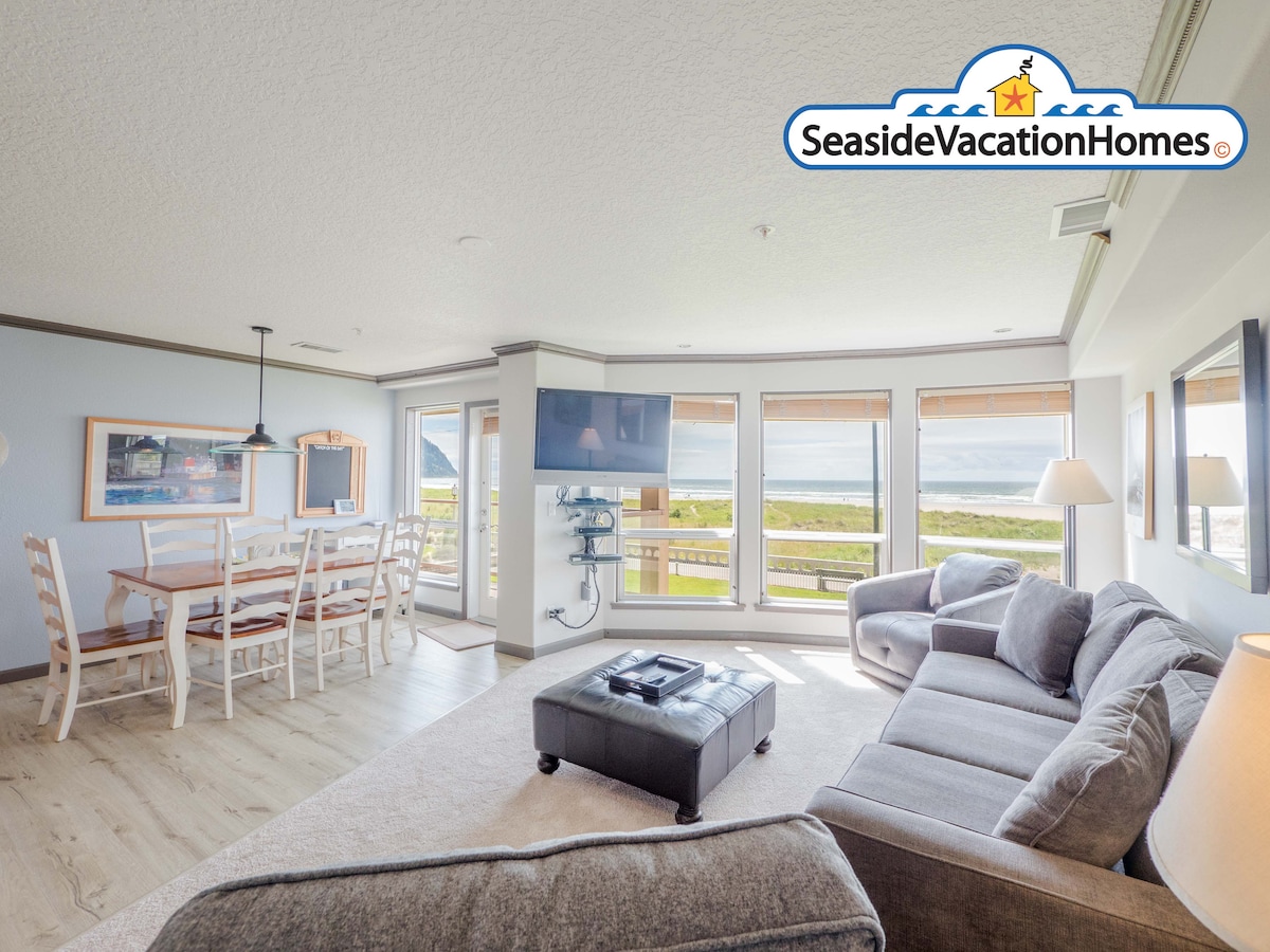 Like New SEASIDE OCEANFRONT Condo on the Promenade!Gorgeous Ocean View with Balcony! Open Living, Dining Room & Brand New Kitchen, Elec Fireplace, new furnishings, comfy new Queen sofa sleeper, Desk with computer, printer/scanner, new 60" TV's with cable, free Internet.WORK REMOTELY!Master Bedroom Suite has comfy new King Sleep Number mattress with it's own private remod bath with shower/tub combo.2nd Full Bath is remod & has shower!One of the nicest oceanfront in Seaside. See our 2nd floor unit