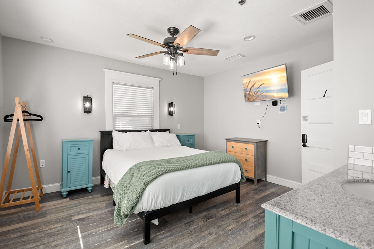 Room 3 has a King Size bed, a private bathroom and shower within the room. This room also has a unique edition making the room truly special, being the massive, walk in steam shower in the room! Access to common areas- living, dinning room, chefs kitchen & TV room *upstairs room. This inn is located in a renovated Craftsman home in downtown Tarpon Springs. Close to Downtown Shops and Restaurants. Close to the Sponge Docks, Sunset Beach, this charming place to stay provides easy access downtown