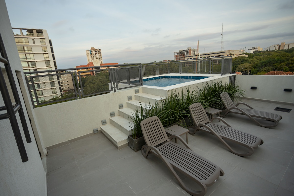 Διαμέρισμα που βρίσκεται σε υψηλό όροφο, με μπαλκόνι και ανεμπόδιστη θέα, πλήρως εξοπλισμένο για άνετη διαμονή: - Υπέρδιπλο κρεβάτι με σκληρό στρώμα υψηλής πυκνότητας. - Χώρος εργασίας με γραφείο και σύνδεση WiFi - Έξυπνη τηλεόραση 55 ιντσών. - Ταράτσα με πισίνα και γυμναστήριο. - Quincho - Πλυντήριο - 24ωρη ασφάλεια Μια εξαιρετική τοποθεσία: - Βρίσκεται στον Εταιρικό Άξονα, μόλις 5 λεπτά από το Shopping del Sol και το Paseo La Galería. - 15 λεπτά από το Διεθνές Αεροδρόμιο Silvio Pettirossi.