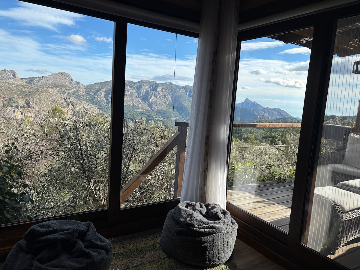 Nos encontramos en el bosque, en el corazón de la Sierra de Aitana, a 1000mts de altitud; zona de reserva natural, con ciervos en libertad, águilas, búhos, jabalies, arruis, perdices y más animales silvestres. La cabaña de madera esta totalmente equipada y aislada de tal manera que es perfecta para disfrutar en invierno y verano. Nos auto-abastecemos de energía eléctrica con una instalación híbrida solar-eólica. La finca se sitúa a quince minutos de Sella.