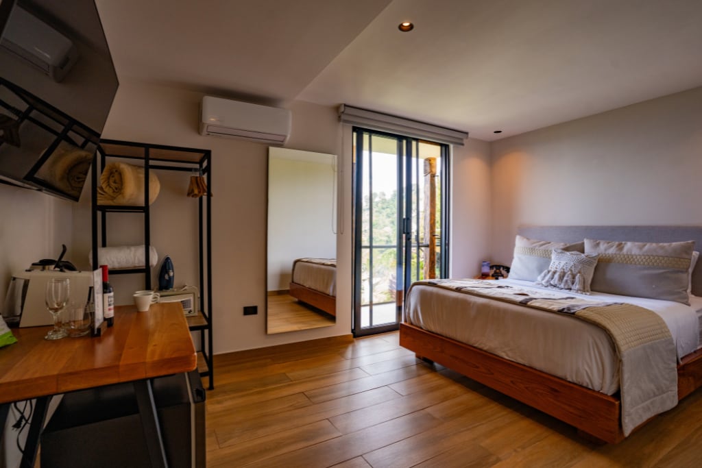 Ξυλόσπιτο με ένα (1) ευρύχωρο και πλήρες δωμάτιο, ένα (1) διπλό κρεβάτι, ιδιωτικό μπάνιο σε φυσικό περιβάλλον και μίνι μπαρ. Ο θόλος του ξυλόσπιτου με ιδιωτικό μπαλκόνι. Χαλαρώστε σε αυτόν τον χώρο όπου μπορείτε να αναπνεύσετε ηρεμία.