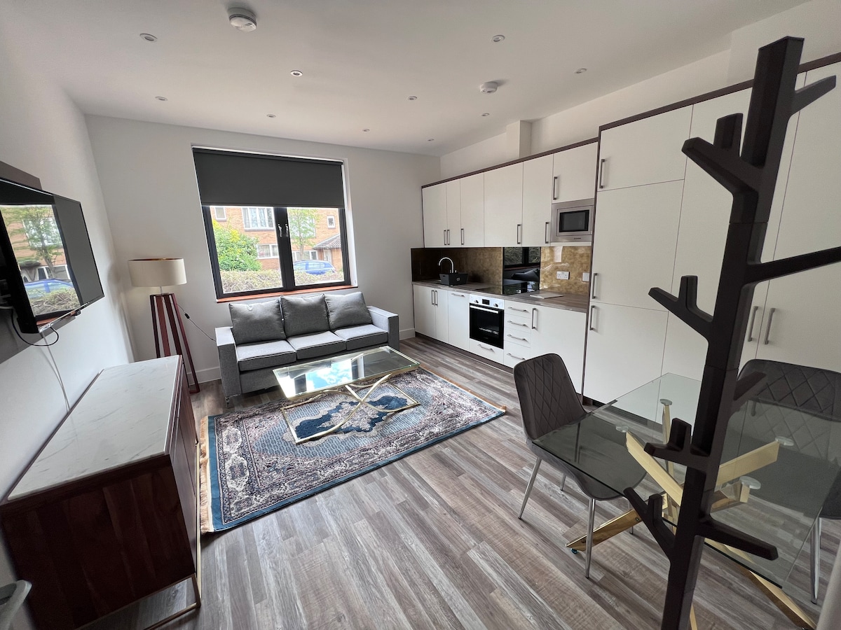 A stylish, self-contained, studio apartment situated in a quiet, leafy, secluded spot right in the centre of Wolverton in Milton Keynes. Restaurants, takeaways, shops, buses and trains (direct to Milton Keynes, Birmingham and London) are all within 5 minutes walk and central Milton Keynes is only 10 minutes drive away. The quaint market town of Stony Stratford is nearby and there are lovely walks by the canal, the river Ouse and the Ouse Valley park which are practically on the doorstop.